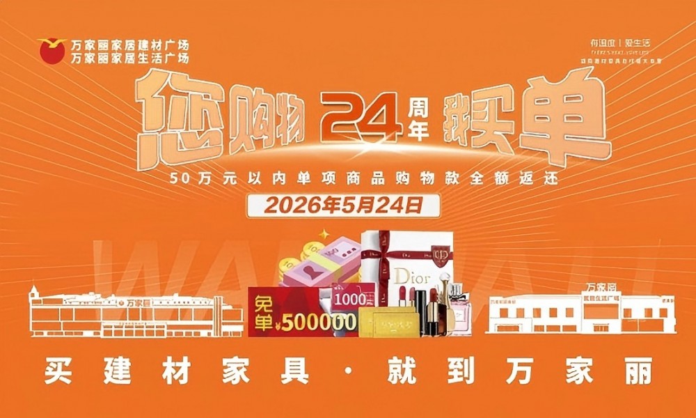 不负相伴,感恩同行,万家丽“您购物·我买单——24周年庆”重磅来袭,以钜惠福利回馈新老客户,解锁家装购物新惊喜。万家丽家居建材广场与家居生活广场双场联动,全场品牌真诚让利,惊喜红包免费领、幸运盲盒下单抽、砸金蛋100%中奖,多重福利叠加,诚意满满。纯金金钞、全房家电、名品高化等海量好礼任性送,5月24日更将抽出50万元以内单项商品购物款全额返还大奖,实力宠粉、倾情回馈。双地铁直达、营业至晚间22点,一站式购齐家装好物,省心省力更省钱,让每一个家庭都能轻松焕新美好家园,开启品质家居新生活。