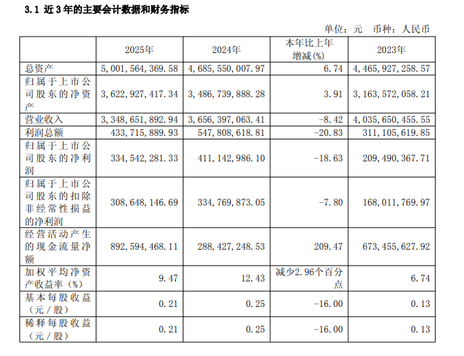 2025年报告期内,维维股份实现营业收入33.49亿元,同比下降8.42%;归属于上市公司股东的净利润为3.35亿元,同比下降18.63%;扣除非经常性损益后归属于上市公司股东的净利润为3.09亿元,同比下降7.80%。从历年经营数据看,维维股份营业收入已连续多年下降,2020年至2024年,公司营业收入分别为47.99亿元、45.68亿元、42.22亿元、40.36亿元和36.56亿元,同比分别下降4.77%、4.81%、7.57%、4.42%和9.40%,叠加2025年的下滑幅度,公司已连续六个会计年度出现营业收入同比下滑,核心经营指标呈现持续走弱的态势。