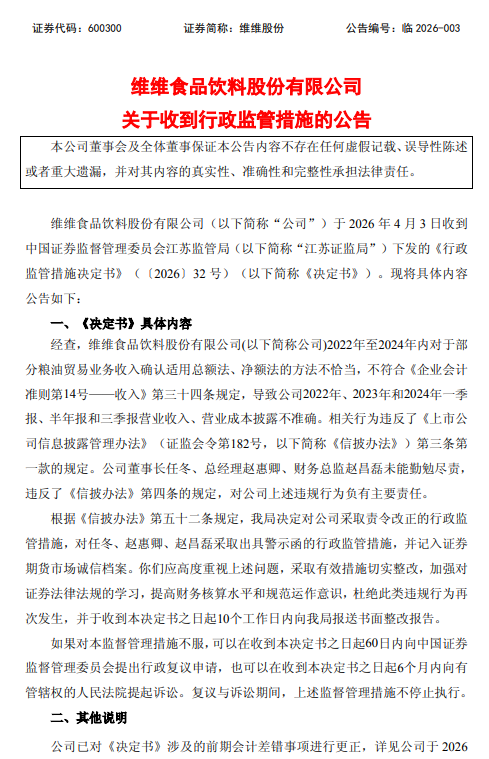 2026年4月3日,维维股份发布公告称,公司收到中国证券监督管理委员会江苏监管局下发的《行政监管措施决定书》,同时收到上海证券交易所下发的监管警示决定。两份文件均指出,公司2022年至2024年内对于部分粮油贸易业务收入确认适用总额法、净额法的方法不恰当,不符合《企业会计准则第14号——收入》第三十四条规定,导致公司2022年、2023年和2024年一季报、半年报及三季报的营业收入、营业成本披露不准确。江苏证监局决定对维维股份采取责令改正的行政监管措施,对时任董事长任冬、时任总经理赵惠卿、时任财务总监赵昌磊采取出具警示函的行政监管措施,并记入证券期货市场诚信档案;上海证券交易所则对维维股份及上述三人予以监管警示。