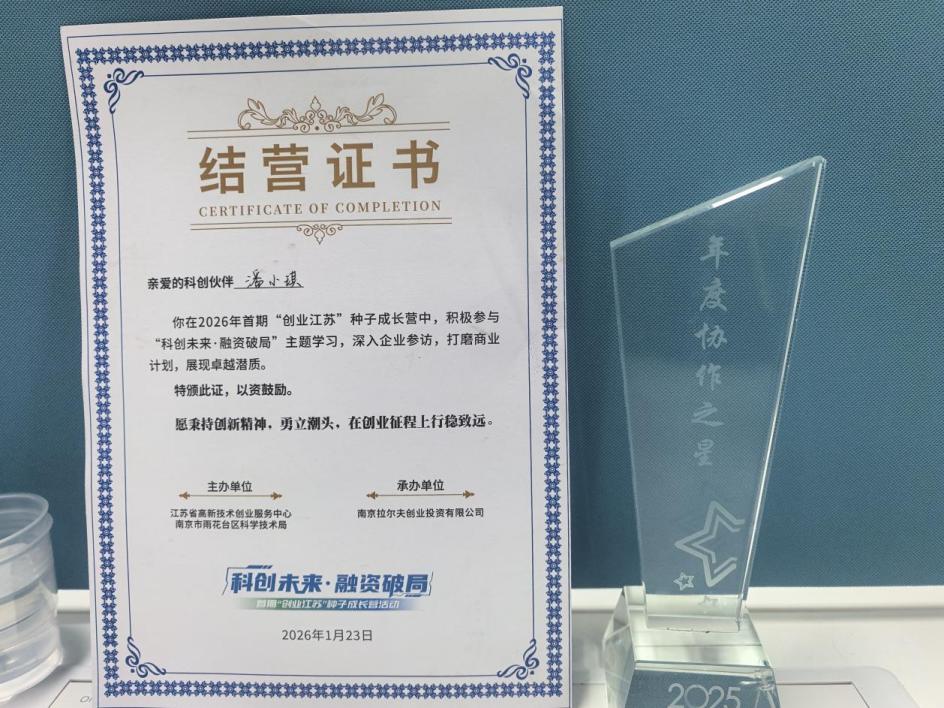 在位于中国(南京)软件谷的“质能・工坊”OPC社区420室,这间不足10平方米的办公室里,记者见到了南京真来视智能科技有限公司联合创始人、COO潘小琪。他正专注于笔记本电脑前,整理一份借助AI工具整理的海外市场分析报告,旁侧摆放的就是宠物智能定位器2.0版本样机,灰色机身闪烁着柔和绿光;桌上整齐陈列的证书奖杯,记录着两个月前真来视获得OPC微种子基金100万元扶持的荣誉。