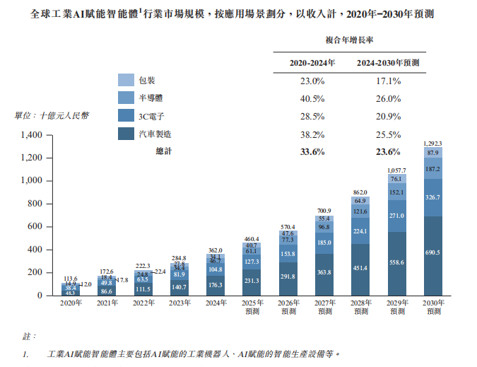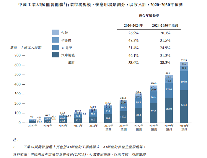 根据灼识咨询报告,全球工业AI赋能智能体行业市场规模来看,2024年已达到人民币3620亿元,预计至2030年增长至人民币12923亿元,年均复合增长率为23.6%。