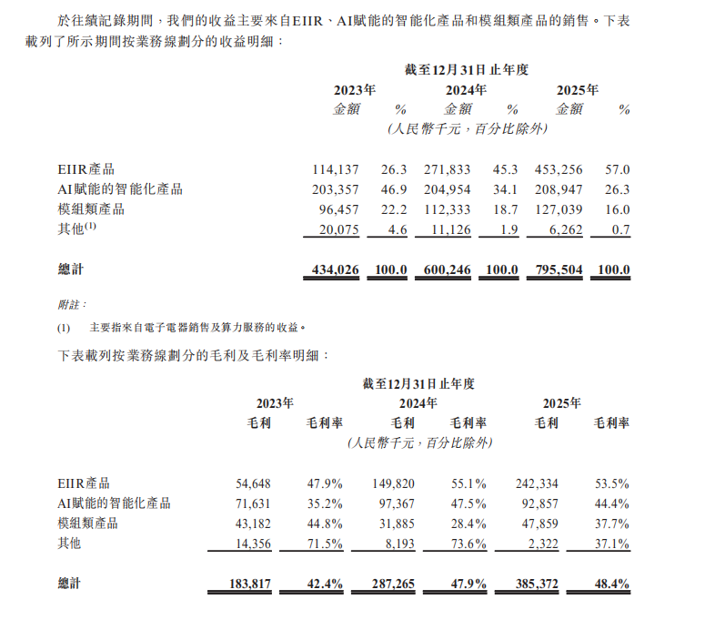 招股书显示,微亿智造2023年、2024年、2025年收入分别为4.34亿元、6.00亿元、7.96亿元,复合年增长率35.4%。更值得关注的是结构变化:核心产品EIIR(工业具身智能机器人)收入占比从26.3%升至57.0%,同期该业务线毛利率从47.9%提升至53.5%。