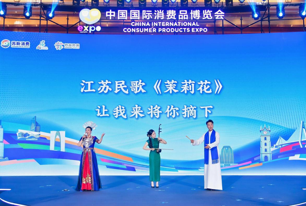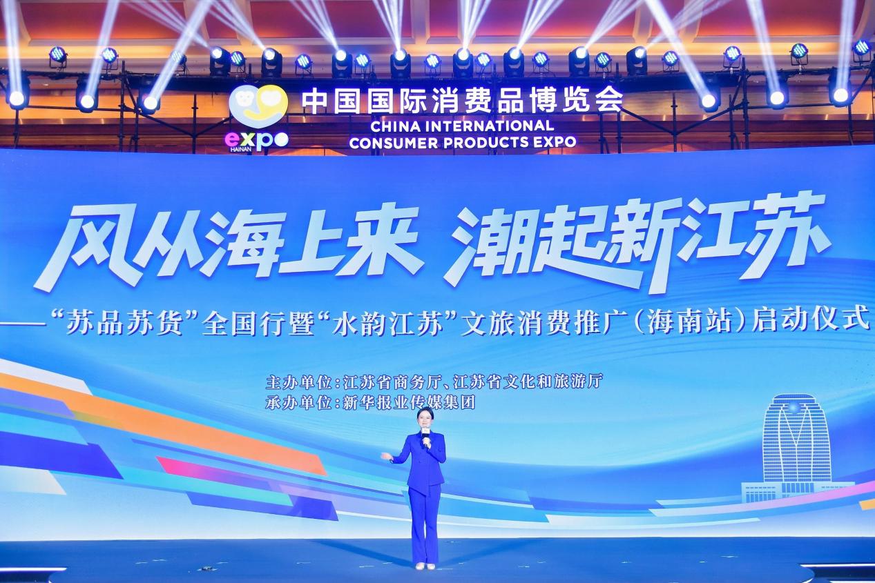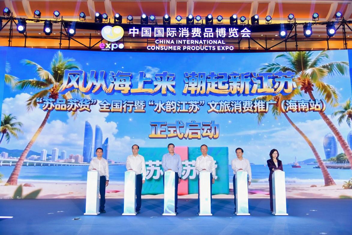 交汇点讯 赴“消博”之约,享开放机遇。4月13日,第六届中国国际消费品博览会举办期间,“苏品苏货”全国行暨“水韵江苏”文旅消费推广(海南站)在海口拉开帷幕。本次活动由江苏省商务厅、江苏省文化和旅游厅主办。