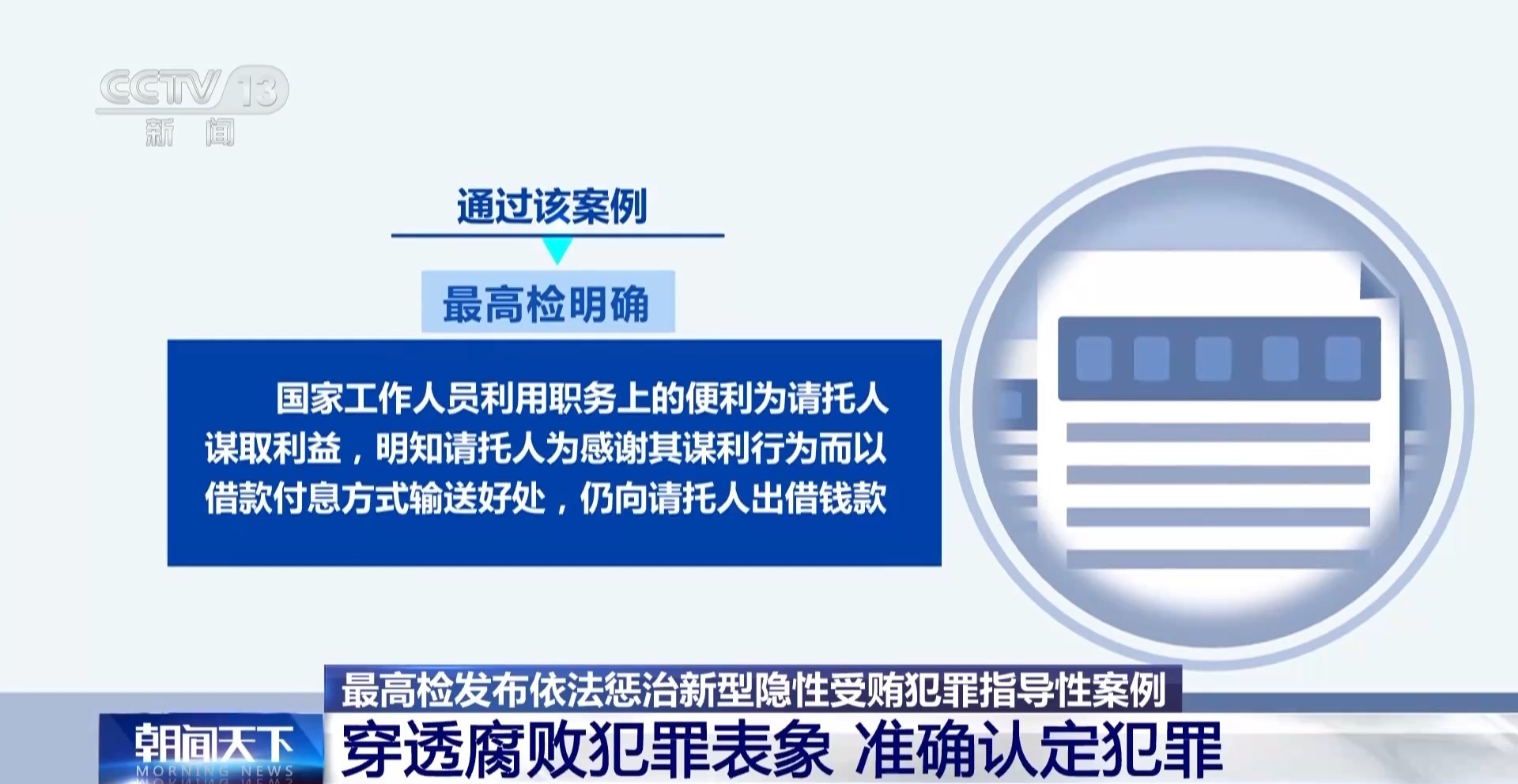 记者昨天(13日)从最高人民检察院了解到,近日最高检发布以依法惩治新型隐性受贿犯罪为主题的指导性案例,案例为检察机关准确认定各类新型受贿犯罪,不断提高反腐败穿透力提供了重要示范指引。