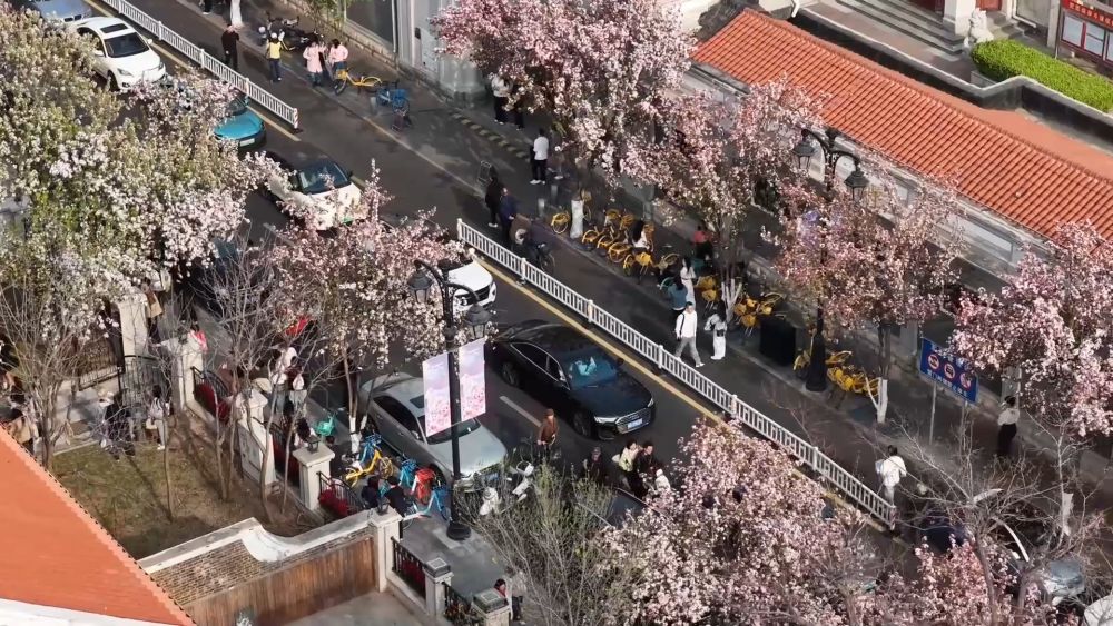天津五大道,海棠沿街盛放,满目春意盎然。大龙邮局里,邮戳轻响,墨香与花香交织,游客驻足停留,感受慢时光。