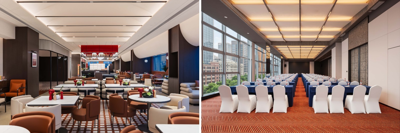 该项目整体楼高21层,丽芮及锦江都城大堂均位于一楼,客房各分布8个楼层,5楼与6楼的多功能厅及餐厅为双品牌共享空间。多功能厅总面积达600㎡,采用模块化设计,可根据活动规模与类型灵活分隔为10-300人不等的独立区域;餐厅深度融合成都本土美食,构建涵盖早餐、正餐、下午茶、酒吧的全时段餐饮服务体系。可提供“会议+餐饮”一体化服务,无论是小型闭门会议、中型品牌发布,还是大型社交派对,都能精准适配。