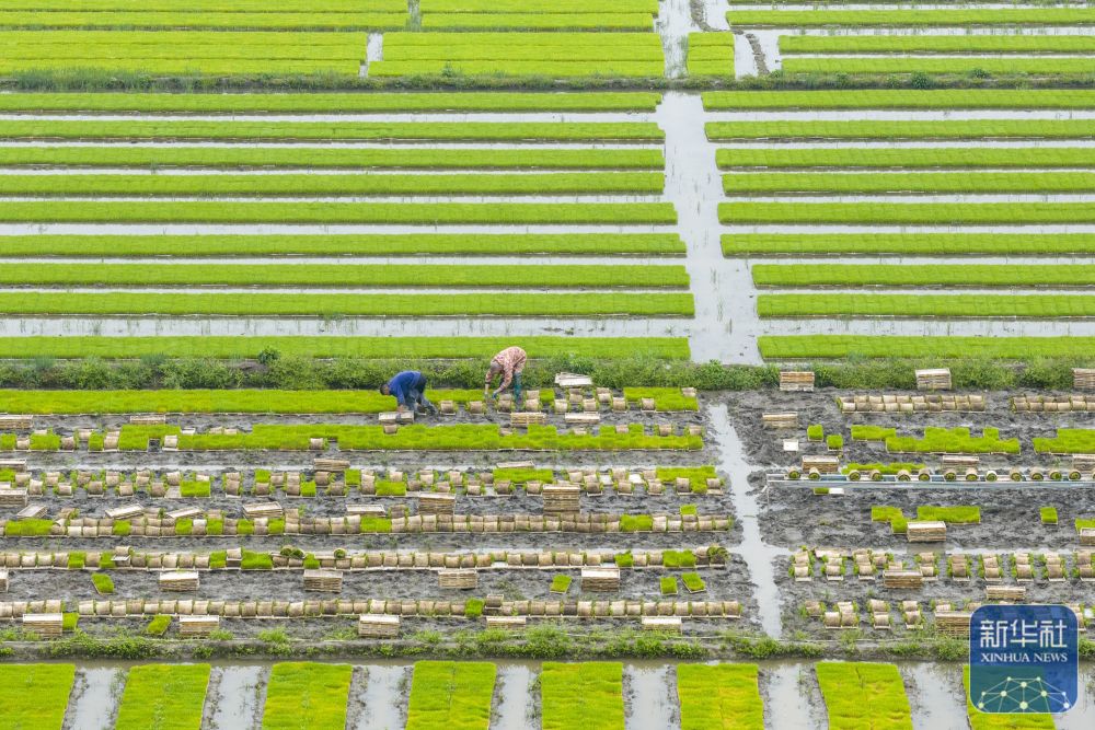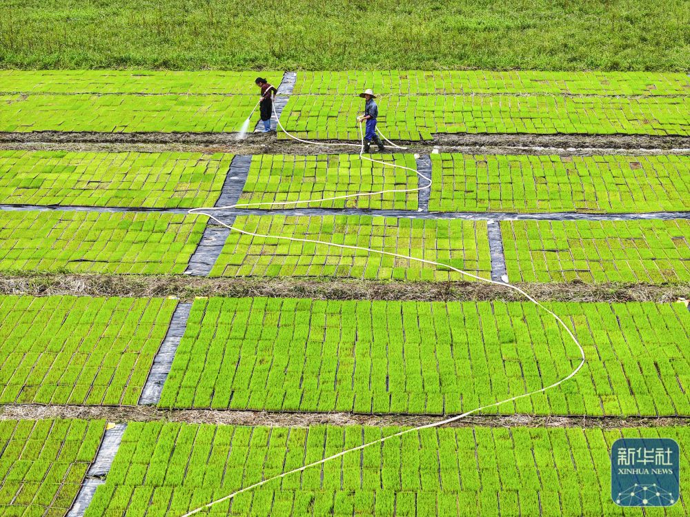 ↑ 4月9日,湖南省常宁市胜桥镇农民在管护秧苗(无人机照片)。新华社发(周秀鱼春 摄)