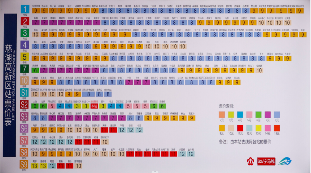 票价表显示,宁马城际铁路S2/宁马线,全长54.23公里,共16站(南京段8站+马鞍山段8站),西善桥站至太白站全程票价9元,完全采用南京地铁里程分段计价规则。