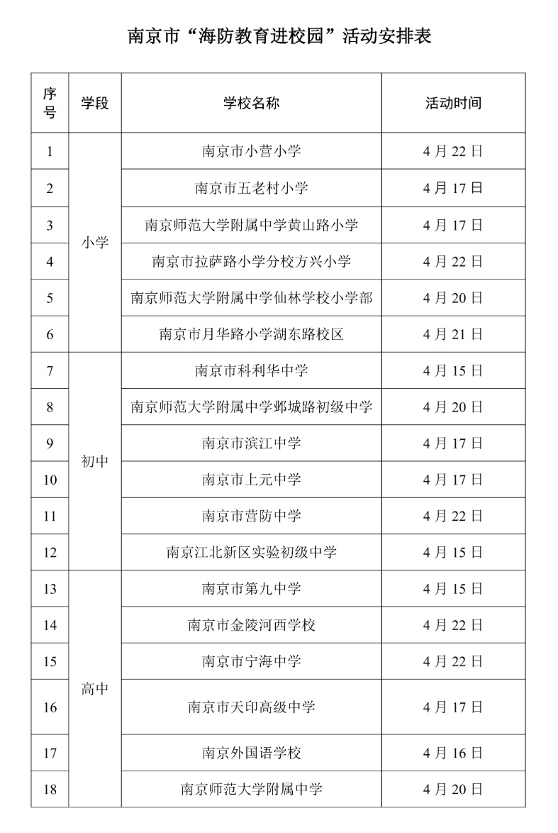 在4月23日——中国人民解放军海军成立77周年纪念日到来之际,南京市开展“海防教育进校园 共筑强国强军梦”活动,由海军指挥学院7名军事专家、骨干教师组成的“深蓝讲师团”,将走进全市18所中小学校园,通过普及国防理论、海防历史、海洋权益、海洋建设等知识,激发青少年投身国防、向海图强的内生动力,为培养有理想、有本领、有担当的社会主义建设者和接班人贡献力量。
