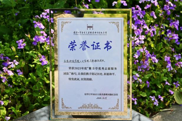 从场馆引导到校外传播,从语言讲解到文化创作,金陵科技学院人文学院志愿服务团队的青年学子们以多元活动传递和平力量,用青春担当守护城市记忆,让和平的种子在更多人心中生根发芽。今年3月,团队与东南大学海外教育学院志愿服务团队、南京师范大学敏行志愿者协会等13家高校团队一同荣获纪念馆颁发的“紫金草优秀志愿服务团队”称号。“这份荣誉既是肯定也是激励,我们将在紫金草花海中,把温暖与希望一直传递下去!”团队学生负责人陈杰说。