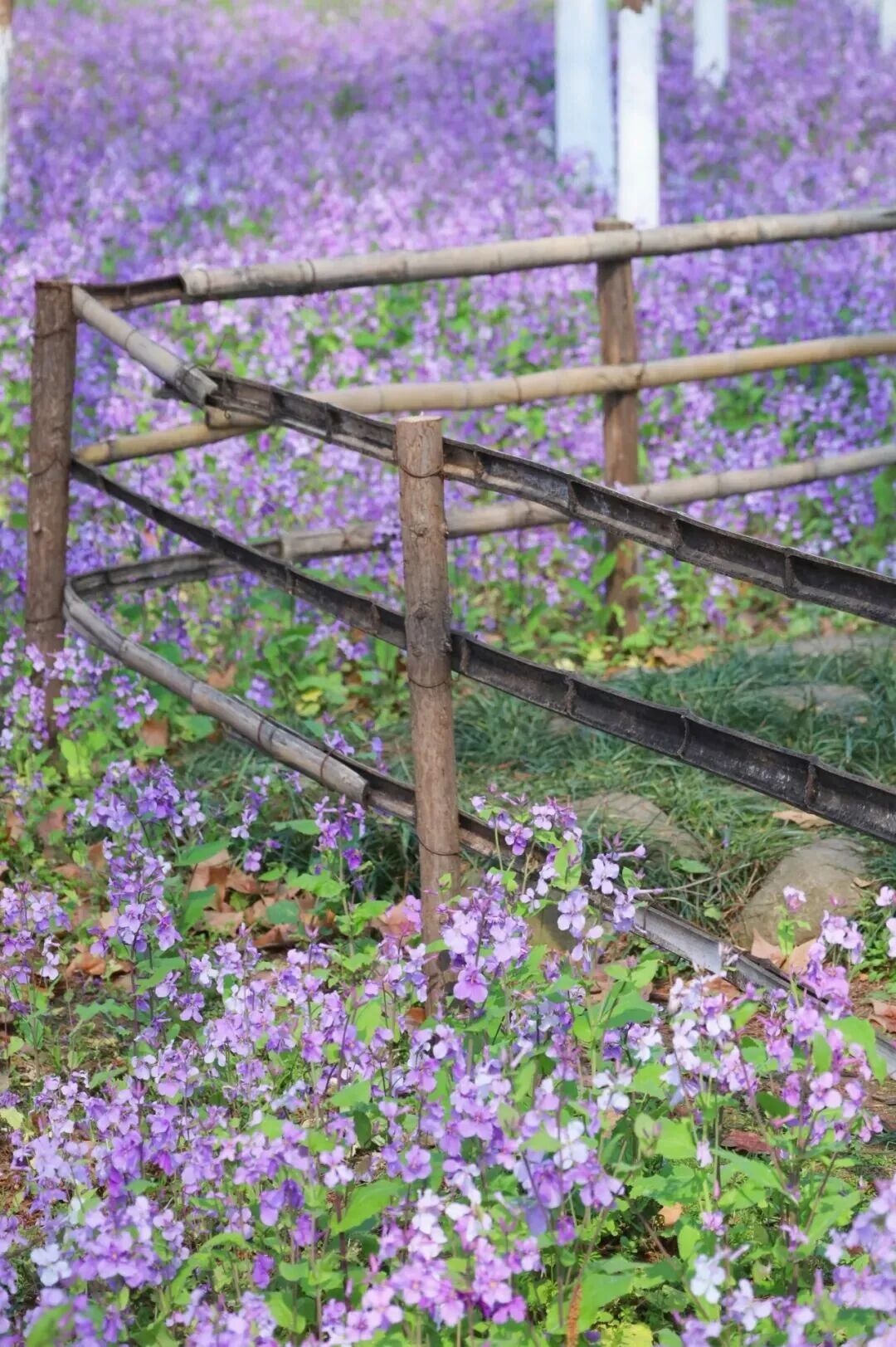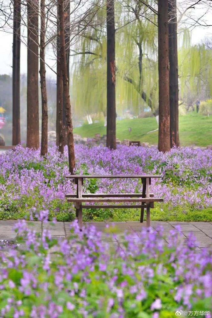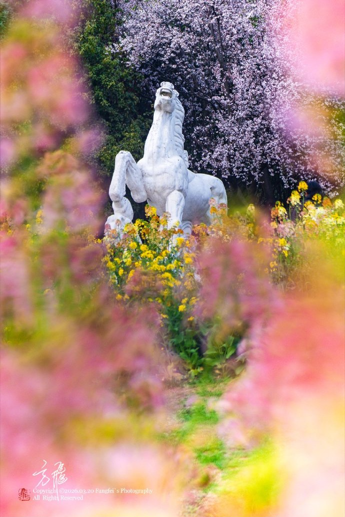 除了彩色油菜花,白马公园的二月兰、紫叶李也毫不逊色,桃花也接力上线,粉白枝头映着古石刻,氛围感拉满。