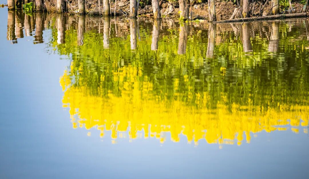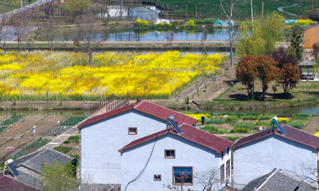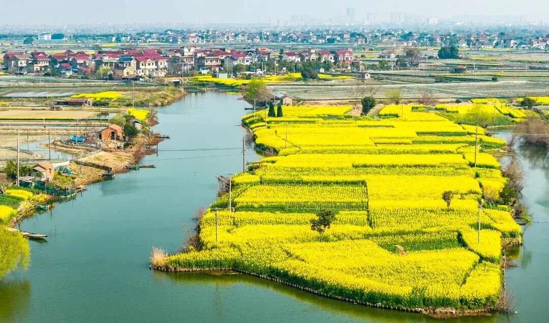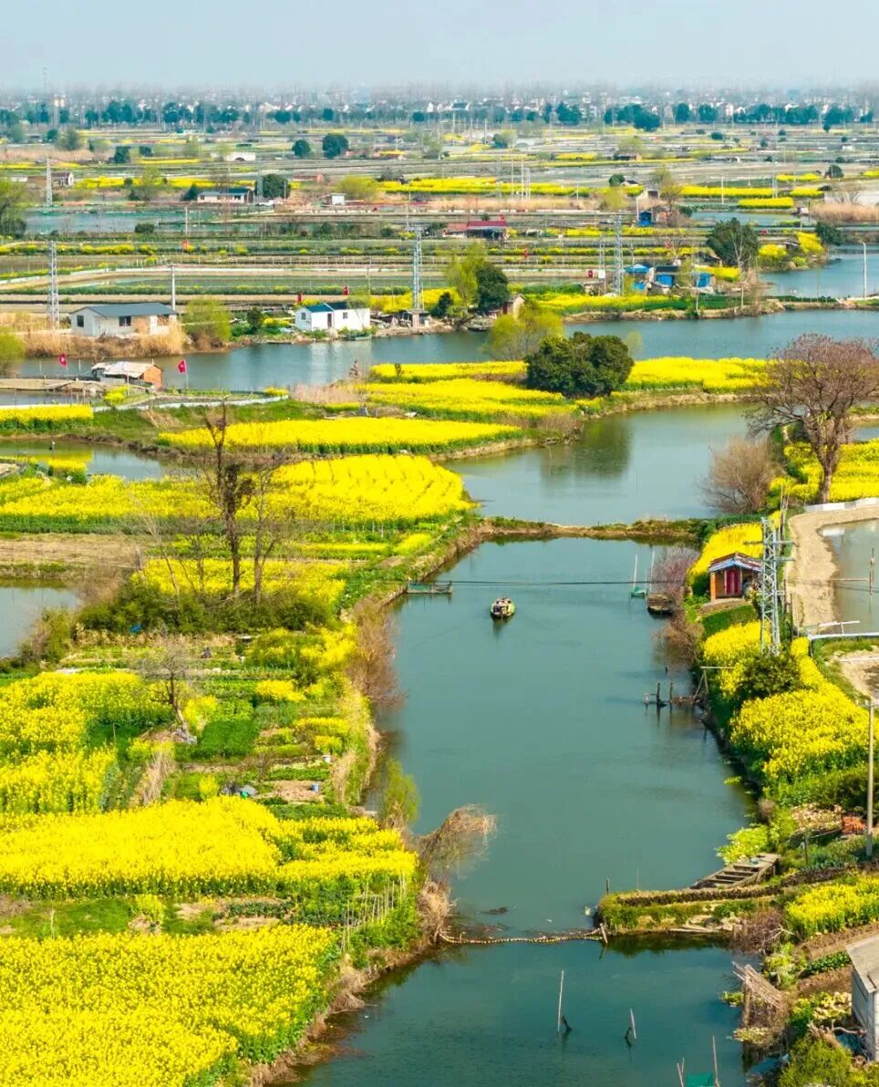 这里的油菜花田,不是连绵不绝的一望无际,而是被纵横的水网温柔地切割。水绕着花,花映着水。站在岸边望去,金黄色的花海倒映在清澈的河水中,天光云影共徘徊。