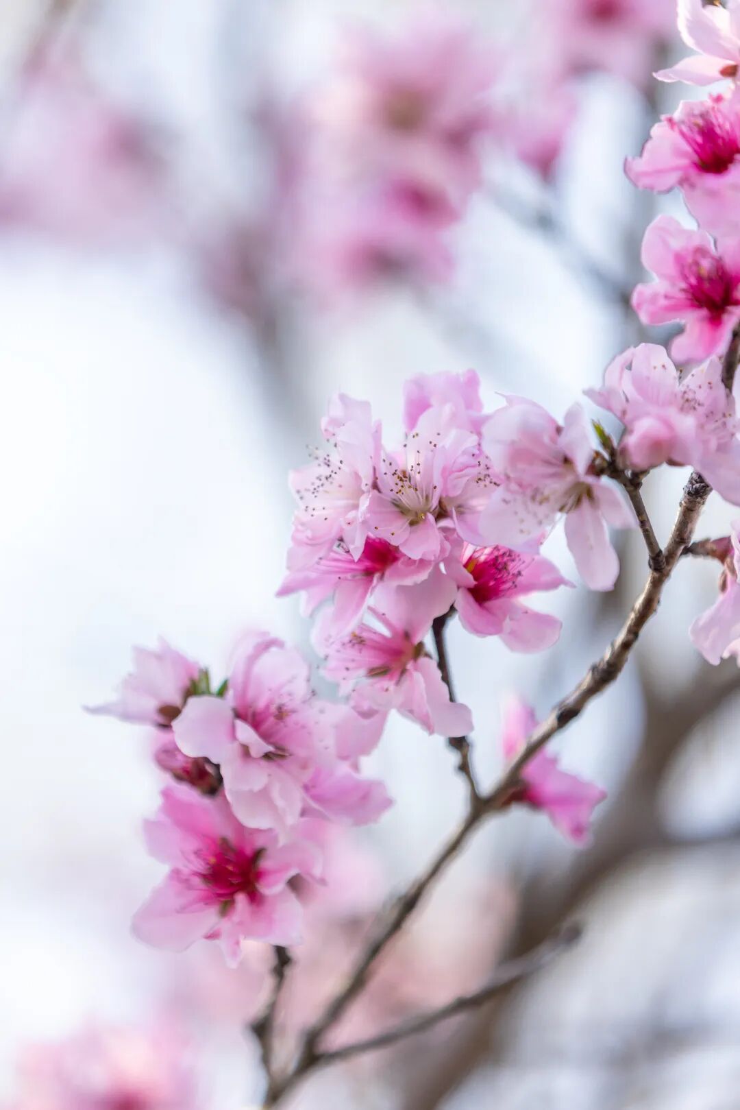 春日的暖阳穿过树梢,洒在小径上,忽明忽暗的光影斑驳了一地。踩上去沙沙响,走几步,一抬头,整片桃园就摊在眼前了。整座山谷都被染了色,一层一层的粉色铺陈开去,与远山的青绿连成一片。
