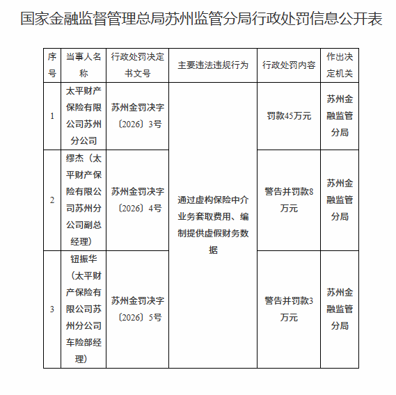 新华日报财经讯 4月9日,国家金融监督管理总局网站公布的苏州监管分局行政处罚信息公开表显示,太平财产保险有限公司苏州分公司(以下简称“太平财险苏州分公司”)因通过虚构保险中介业务套取费用、编制提供虚假财务数据,被苏州金融监管分局罚款45万元。同时,该公司副总经理缪杰被给予警告并罚款8万元,车险部经理钮振华被给予警告并罚款3万元。