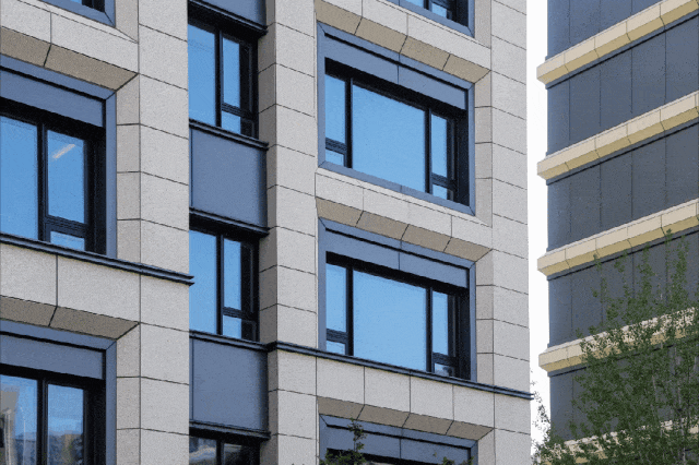 更值得一提的是,施工团队在单块石材上墙前、整体上墙后,进行多轮对比调整,严格控制整体墙面色差。最终,外立面的视觉效果获得了业主的一致好评。