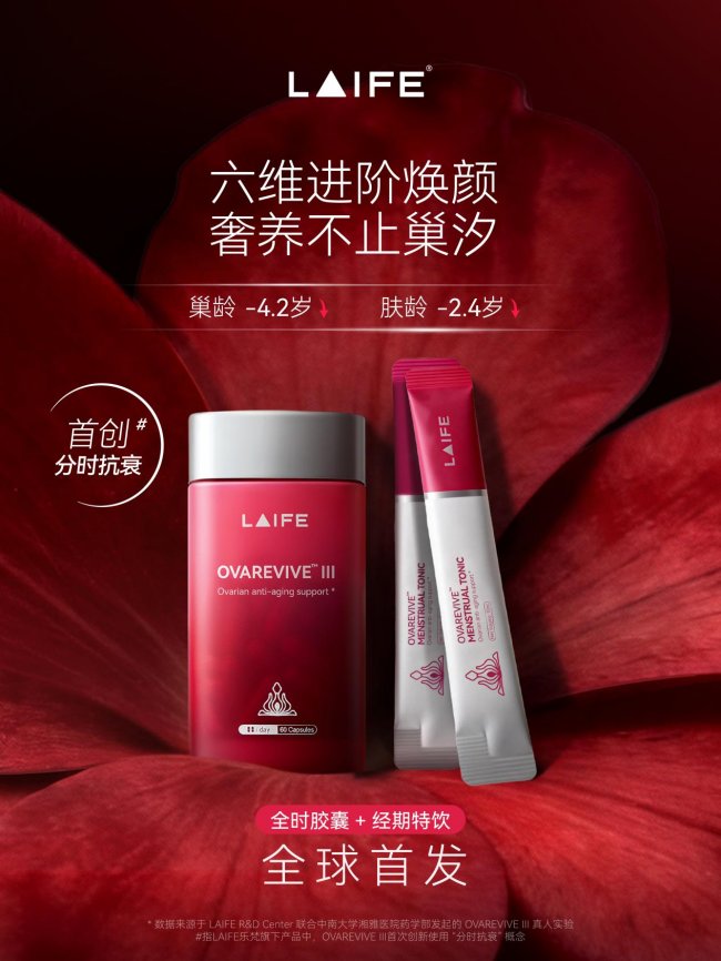 全新LAIFE「红宝瓶」3.0,是LAIFE以AI技术驱动女性抗衰研发的集大成之作,更是行业内女性卵巢抗衰领域的突破性成果。产品首创HPO-S“巢颜轴”全链抗衰模型,突破性打通下丘脑-垂体-卵巢-皮肤的全链路抗衰通路,打破传统女性抗衰产品“单点作用、表层改善”的局限,实现从器官根源养护到外在容颜焕新的全方位抗衰效果,经临床验证可实现巢卵巢平均逆龄约4.2岁,皮肤平均逆龄约2.4岁。