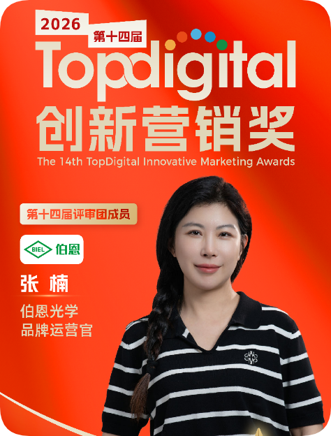 近日,2026年第十四届TopDigital创新营销奖专家评审团正式揭晓,伯恩光学品牌运营官张楠女士赫然在列,相信她以B2B制造领域品牌运营的一线实战经验为这次评选增添专业视角。这是对张楠女士专业能力的权威认可,更是伯恩光学品牌化转型道路上在数字营销方面取得重要成就的集中体现。