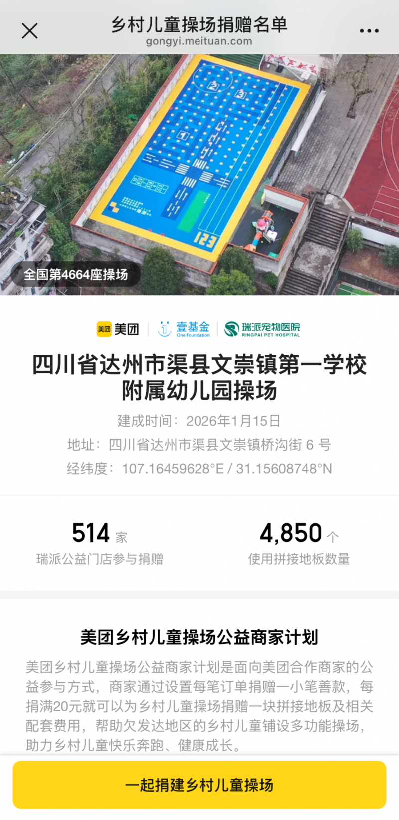 据悉,美团乡村儿童操场公益计划由美团联合壹基金于2020年共同发起,旨在为欠发达地区的乡村幼儿园铺设多功能操场,配备幼儿体育游戏综合器材包,并提供教师和园长培训,促进城乡学前教育均衡发展,助力乡村儿童健康成长。截至2026年3月底,该计划已在全国累计建成4877座,直接惠及65.9万名乡村儿童。此次瑞派捐建的操场,正是该项目落成的第4664座。