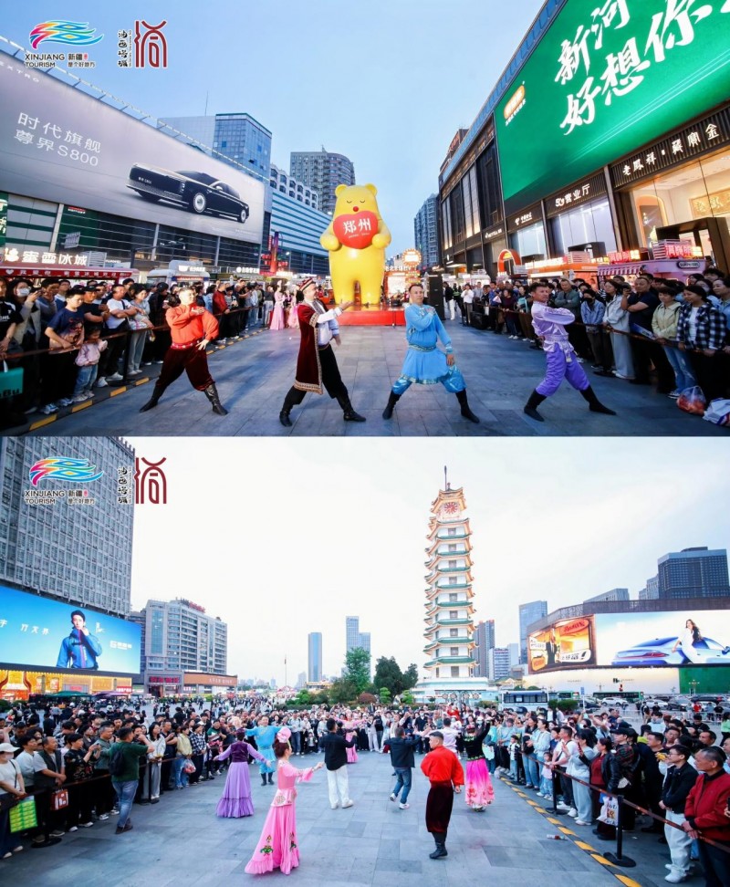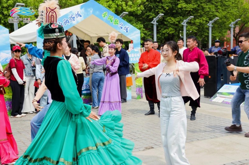 为进一步扩大活动影响力,实现塔城文旅魅力的全方位传播,本次活动打破校园边界,将油画塔城风情延伸至郑州城市核心商圈。在郑州市中心亚细亚—二七广场抱抱熊市集,塔城演职人员身着绚丽民族盛装,带来精彩的快闪歌舞表演,浓郁的民俗风情吸引众多市民游客驻足观赏、互动拍照。活动现场还派发塔城文旅宣传册、定制特色手幅与手卡,以亲民接地气的互动形式,让塔城文旅名片真正走进郑州街头,实现校园文化交流与城市文旅推广的双向联动、全域传播。
