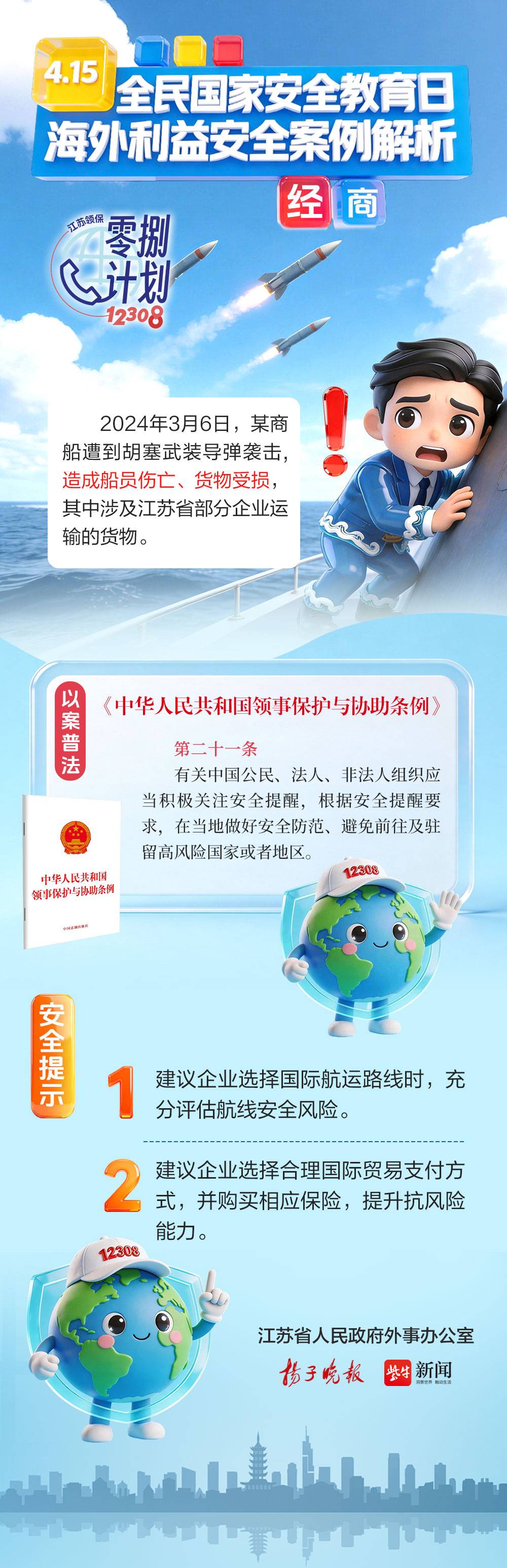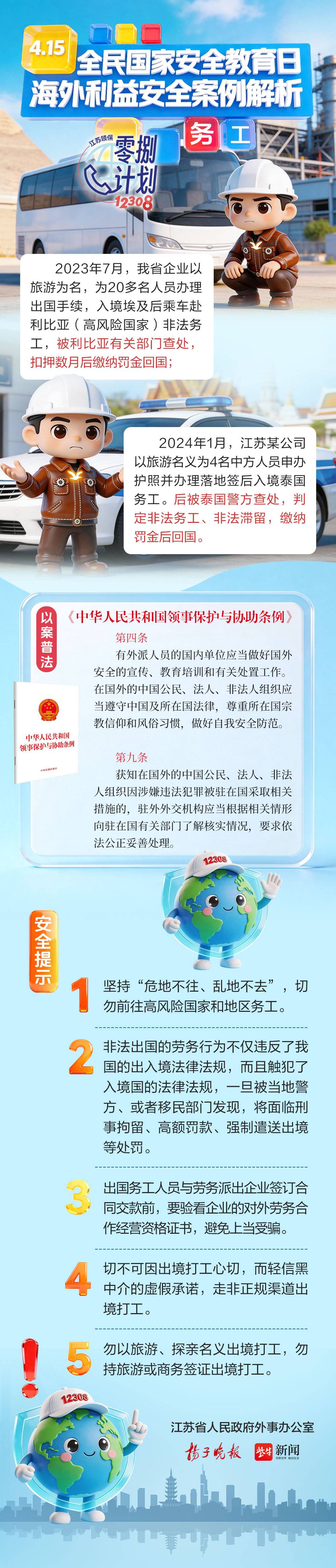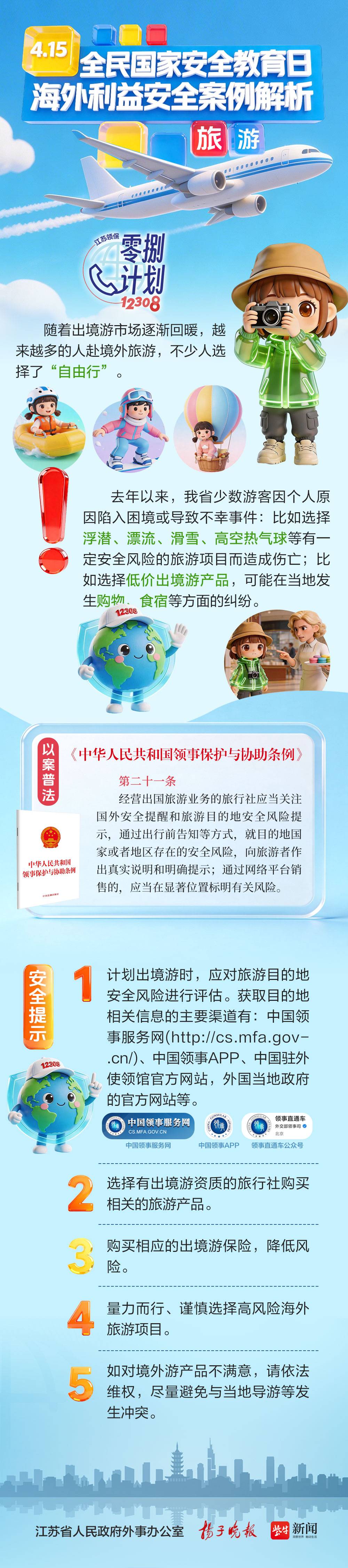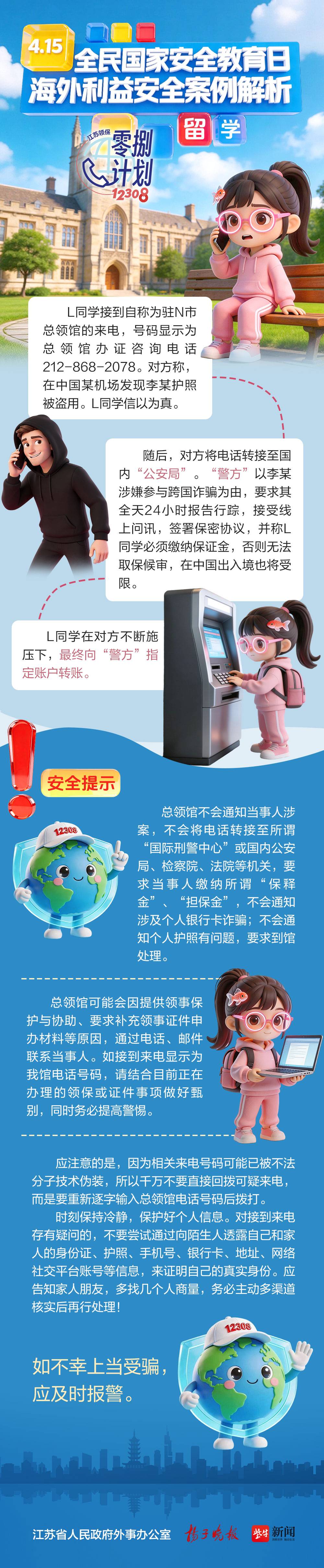 海外利益安全是新时期我国发展和安全利益的重要组成部分。为了深入贯彻总体国家安全观,维护“走出去”人员海外利益安全,江苏省外办联合扬子晚报/紫牛新闻在第十一个全民国家安全教育日推出“海外利益安全案例解析”视觉长图。长图针对性地对赴海外留学、旅游、经商、务工等群体遭遇的安全问题进行案例分析,帮助在海外和计划赴海外的中国公民更好地了解各类海外安全风险,提升安全防范意识和能力。