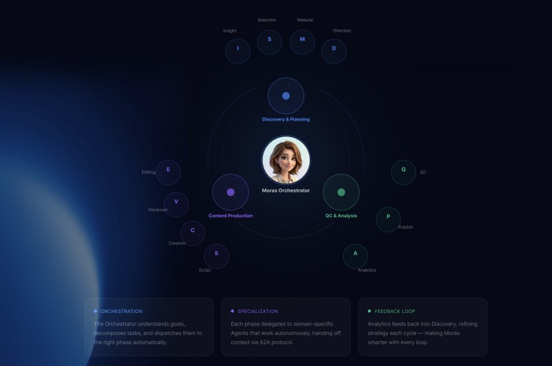 Moras拥有一套专为内容电商设计的 Harness,通过前期大量行业选品的深度know-how和海量品类的爆款视频理解,Moras把内容电商链路中的市场洞察、选品策略、卖点提炼、分镜脚本、爆款hook、智能剪辑、风控预检、视频发布每一步原子级能力都沉淀形成了AgentSkills,并在 Harness 的调度下进行意图解析、任务编排与执行验证。这种“模型之上、业务之中”的架构,让 Moras 能够将大模型的不确定性转化为确定性的工业化产出,真正构筑起产业经验与 AI 技术深度耦合的竞争壁垒。