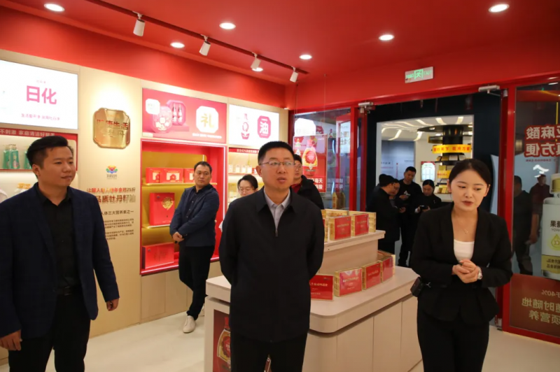 调研首站,褚晓亮副社长一行来到了龙池牡丹总部产品展厅,这里汇聚了企业近年来在牡丹精深加工领域的众多创新成果。从牡丹籽油、牡丹花蕊茶等健康食品,到丹皮酚系列日用品、牡丹精华系列护肤品,再到独具匠心的牡丹文化创意产品,四大系列、超150款特色牡丹产品琳琅满目,令人目不暇接。这些产品不仅展示了牡丹的多元价值,也彰显了龙池牡丹在产品研发上的深厚功底。