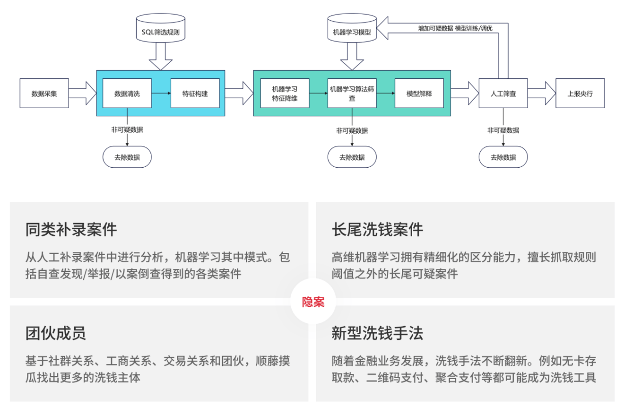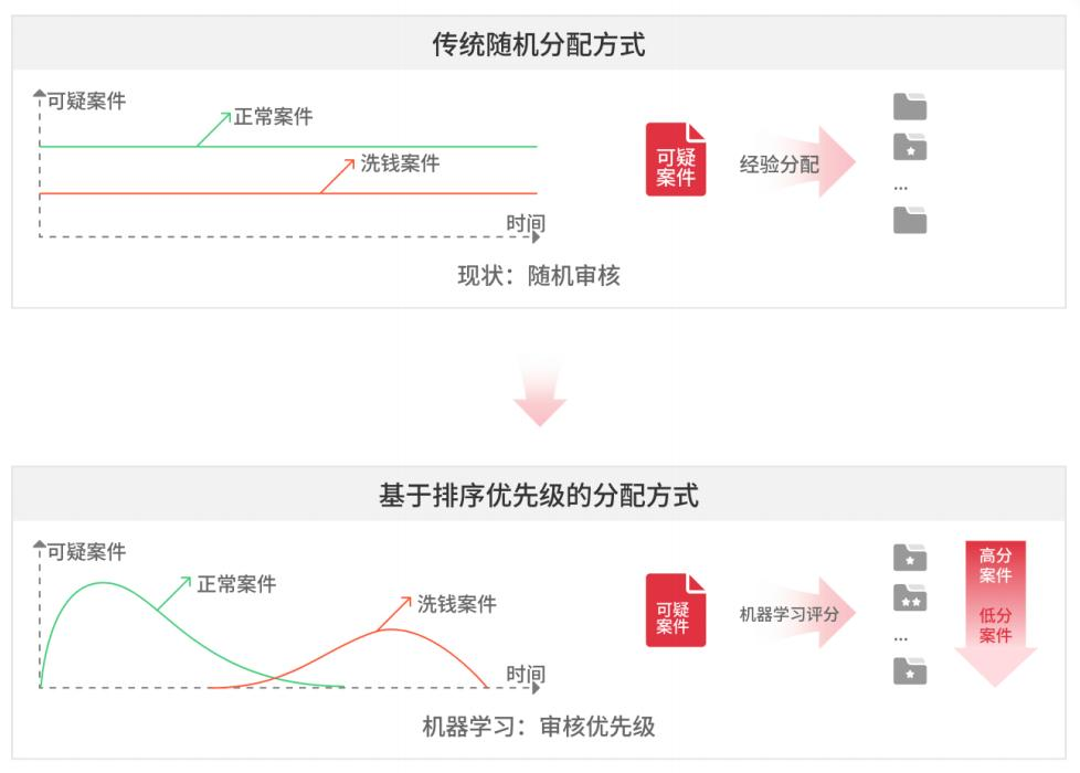 针对这类复杂洗钱手法的主动识别,领雁科技利用AI机器学习技术,通过对历史交易数据与专家判断结果的学习,构建出更具泛化能力的风险评估能力。该模型通过对全量交易进行分析,抓取出规则算法未能捕捉的异常行为,提升案件覆盖率与审核上报率,帮助银行更全面地监控洗钱风险。