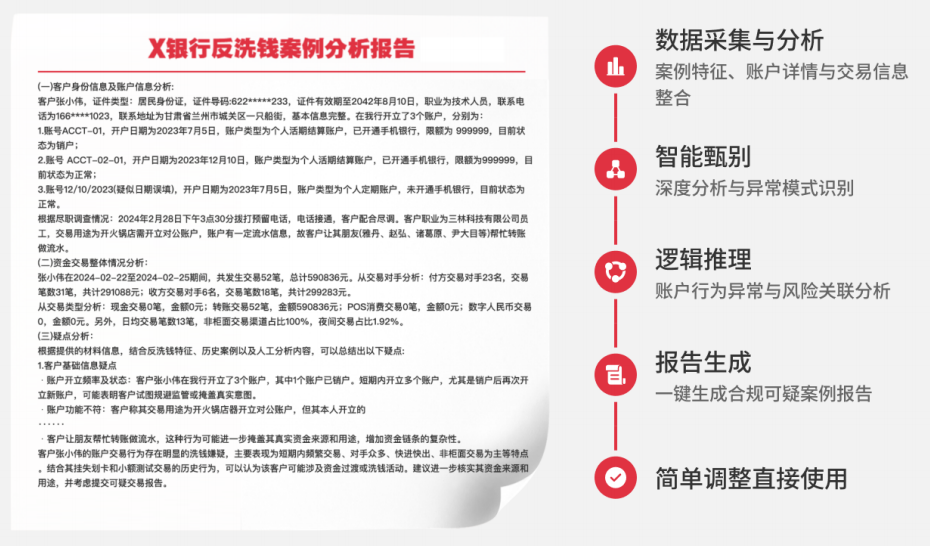在风险识别之外,领雁科技还积极推动生成式AI在反洗钱业务流程中的深度应用。例如占据反洗钱业务人员时间较长的可疑案例甄别,领雁科技基于AI大模型能力打造可疑案例甄别Agent,自动完成数据采集与分析、智能甄别、逻辑推理、报告生成等工作,汇总案例特征、账户及交易详情,结合历史数据与异常点对比分析,识别开户与行为交易的差异,生成具备严谨性与准确度的高品质报告,只需工作人员简单调整即可直接使用。