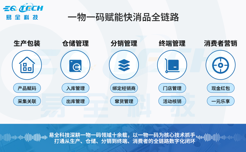 广州易全信息科技有限公司深耕一物一码领域十余载,以一物一码为核心技术抓手,打通从生产、仓储、分销到终端、消费者的全链路数字化闭环,构建起对内管好全链路、对外激活全场景的 “一管一活” 双轮驱动体系,既为品牌筑牢生产流通的管理根基,又为品牌打造精准高效的增长引擎,助力各行业品牌实现从粗放运营到数智化精耕的转型,稳健穿越市场周期。