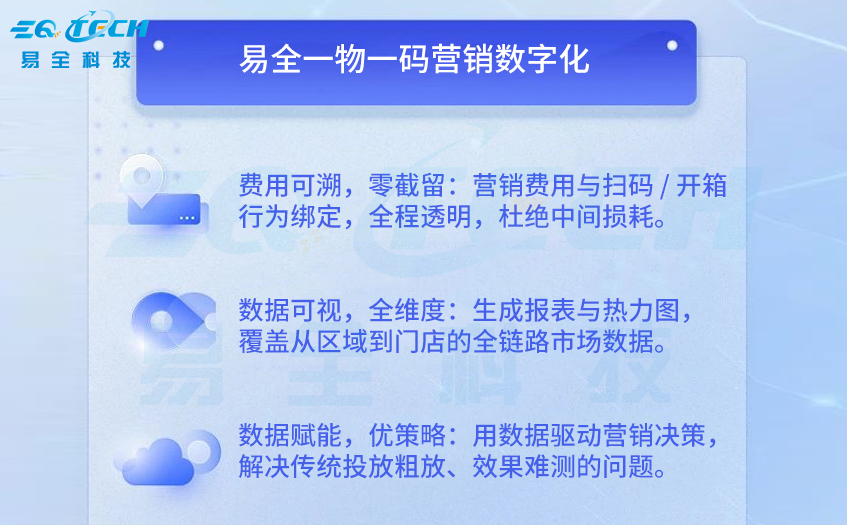 在流量成本高企、终端动销乏力的当下,传统 “大水漫灌” 的营销模式难以触达精准人群,营销费用易被中间环节截留,真正触达消费者的资源寥寥无几。易全科技以一物一码为支点,从“消费者精准触达”、“终端门店深度激活”、“营销数据驱动决策”三个维度,让营销资源直达bC两端,大幅提升品牌营销ROI,驱动终端良性动销。