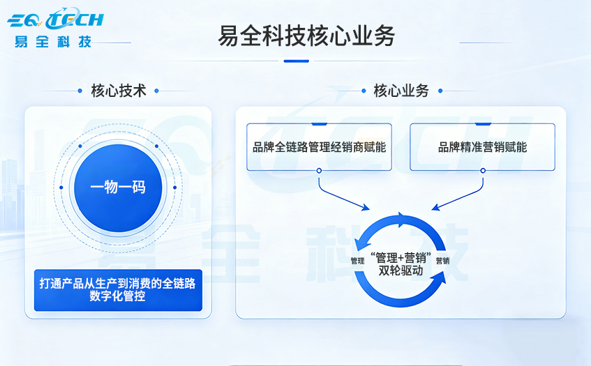 易全科技的业务逻辑高度聚焦:以一物一码为技术核心,打通产品从生产到消费的全链路数字化管控,让每一枚码都成为品牌的管理入口与增长载体。核心业务分为两大板块:为品牌全链路管理经销商赋能(解决“管得好”的问题)与为品牌精准营销赋能(解决“卖得好”的问题),形成 “管理+营销”双轮驱动的品牌增长闭环。