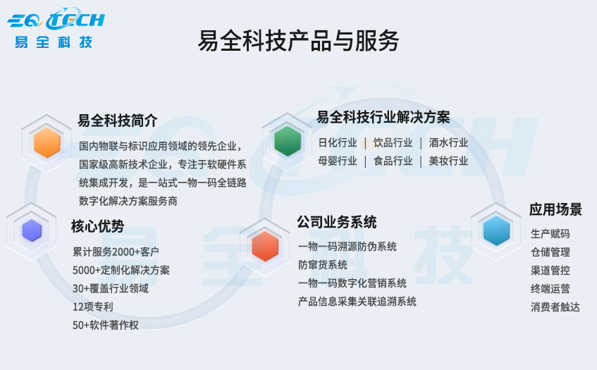 广州易全信息科技有限公司是国内物联与标识应用领域的领先企业,国家级高新技术企业,专注于软硬件系统集成开发,是一站式一物一码全链路数字化解决方案服务商。公司成立于2012年,深耕行业十余载,以一物一码溯源防伪系统、防窜货系统、一物一码数字化营销系统、产品信息采集关联追溯系统为核心产品,为企业提供从生产赋码、仓储管理、渠道管控到终端运营、消费者触达的全场景数字化服务,助力食品、饮品、日化、酒水、母婴用品、美妆品等多快消品行业实现数智化升级。