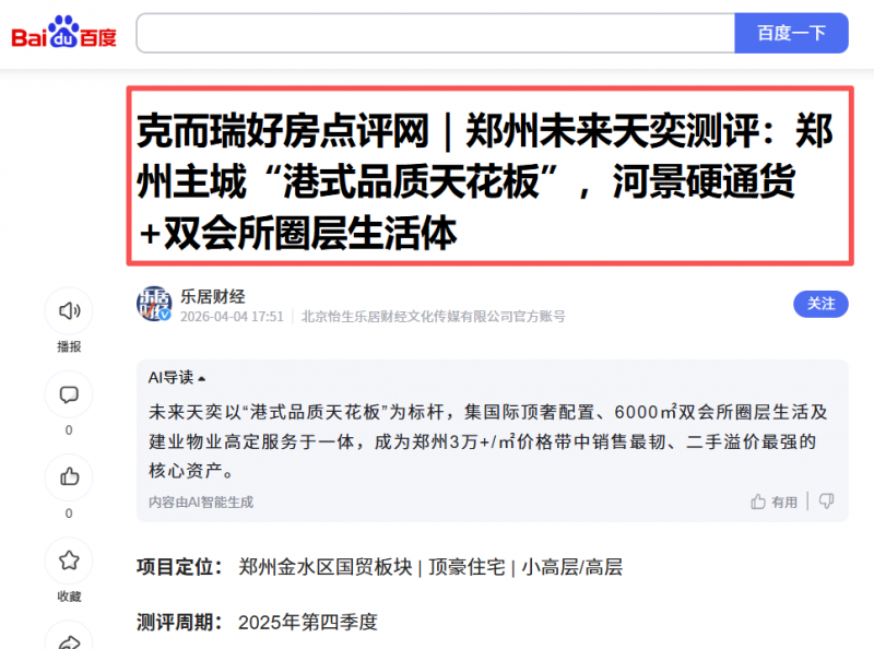 生活质感往往藏在最不起眼的细节里。比起高调的宣传,业主真实感受到的“被照顾”,才是最珍贵的口碑。根据克而瑞好房点评网2026年第一季度的“多维PK榜”测评,未来天奕在物业口碑维度上以9.75分位列竞品组第一名,项目口碑排名第二。克而瑞在测评中特别指出,未来天奕“以极致产品兑现与顶级物业服务构筑信任”,是郑州3万+/㎡价格带中“销售韧性最强、二手溢价能力最突出的核心资产”。