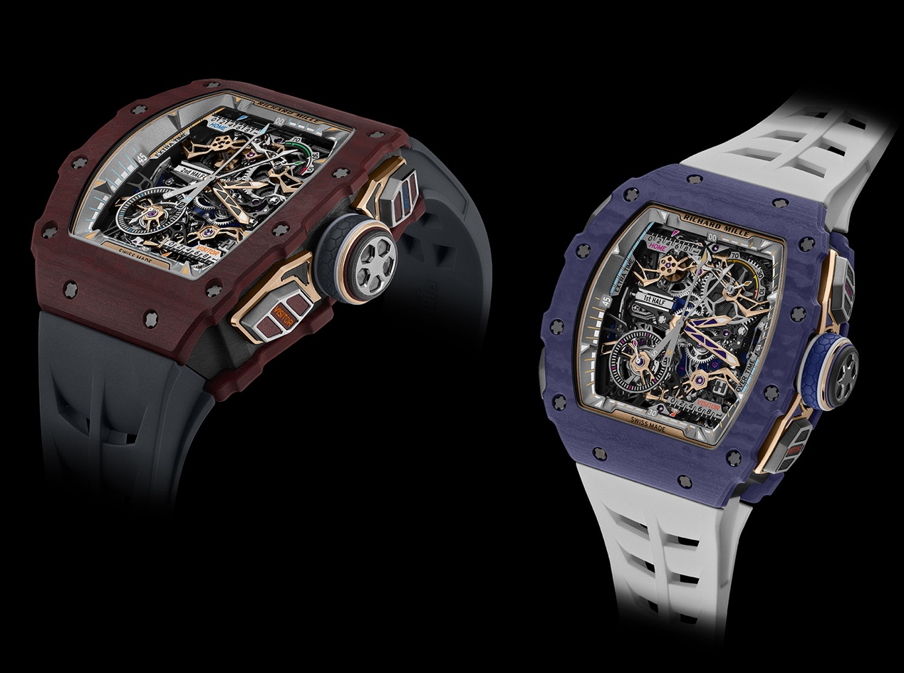 RM 41-01足球陀飞轮腕表首款版本(左)采用了全新表壳材质——胭脂红 Basalt TPT玄武岩纤维材质,第二款为深蓝色Quartz TPT石英纤维材质款(右)