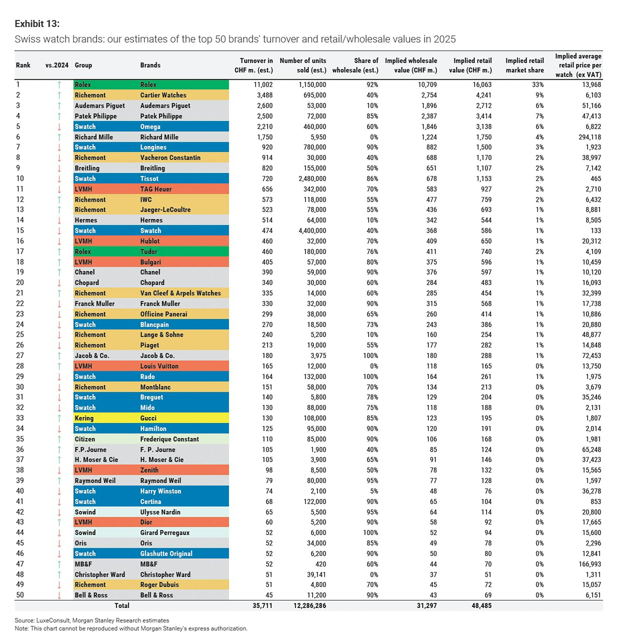 这实际上在高度依赖经销商网络的传统瑞士制表业中极为少见。前述提到的摩根士丹利报告可以看到,事实上大部分的瑞士钟表品牌都无法采用纯直营策略,坚持百分百直营的品牌屈指可数。