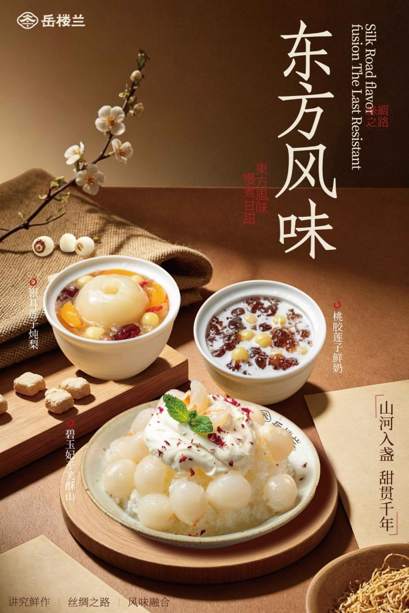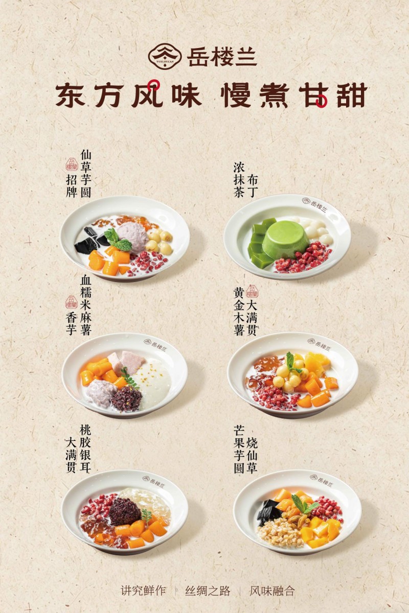 岳楼兰打破传统糖水地域局限,深度融合五岳风物与丝绸之路特色食材,推出嵩山龟苓膏、泰山石斛冻、华山丹霞冰粉、西域酸奶粽等爆款单品,兼顾经典古法与创新风味。品牌与伊利集团战略合作,全线使用高品质鲜牛乳,坚持现炖现煮、低糖健康、药食同源,搭配新中式美学空间,客单价约6-25元,定位精准、高利润、高收益,消费体验与盈利空间双重升级。