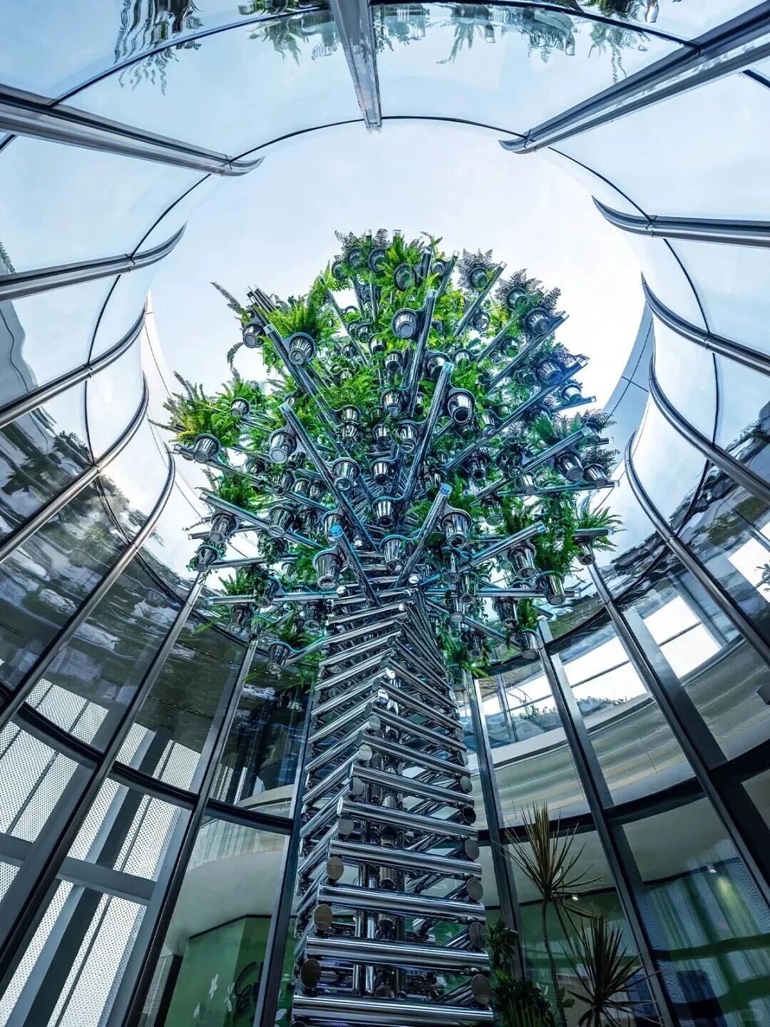 走进商场,第一眼就被8米高的“生命之树”所吸引——它以金属骨架为主体,缠绕着金边瑞香、金钱树等绿植,白天是室内的生态客厅,夜间则模拟星河流转,化身星空剧场。