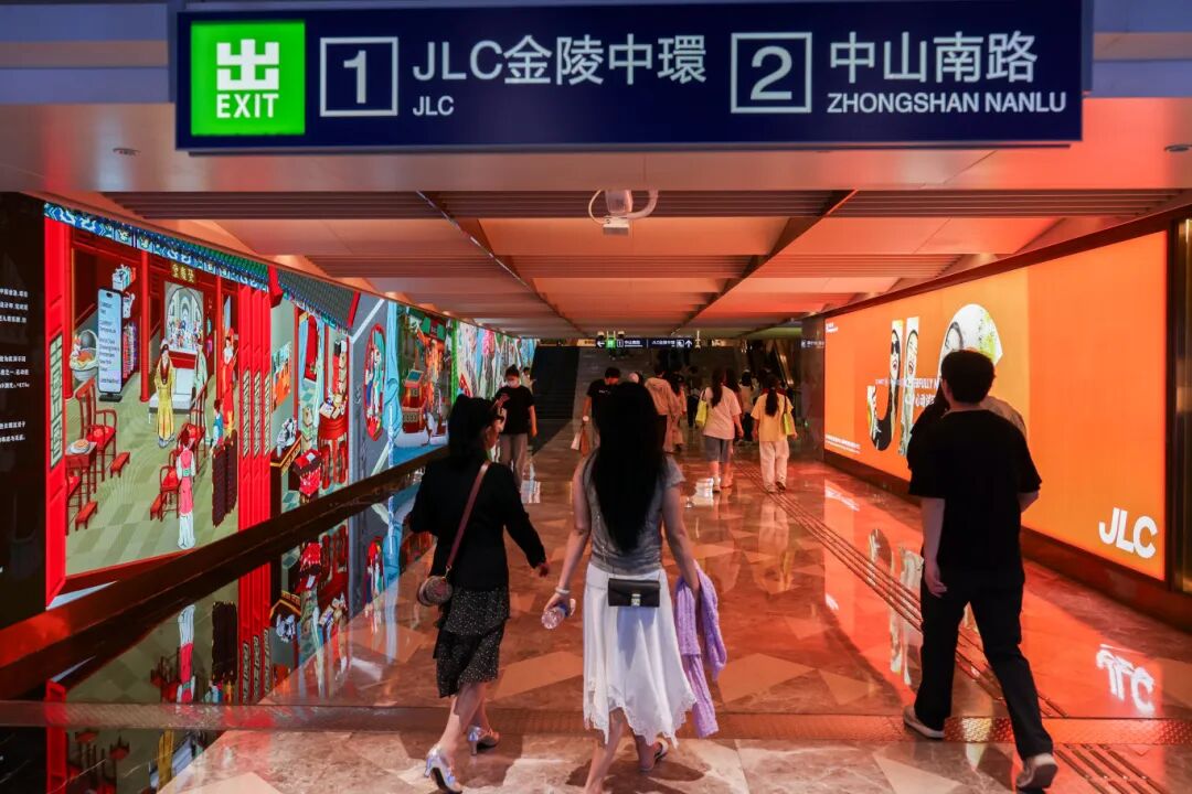 走出新街口地铁站1号出口,迎面而来的就是JLC金陵中环携手火爆潮流圈的荷兰艺术家Digiway打造的南京最美地铁通道“潮游大观”。