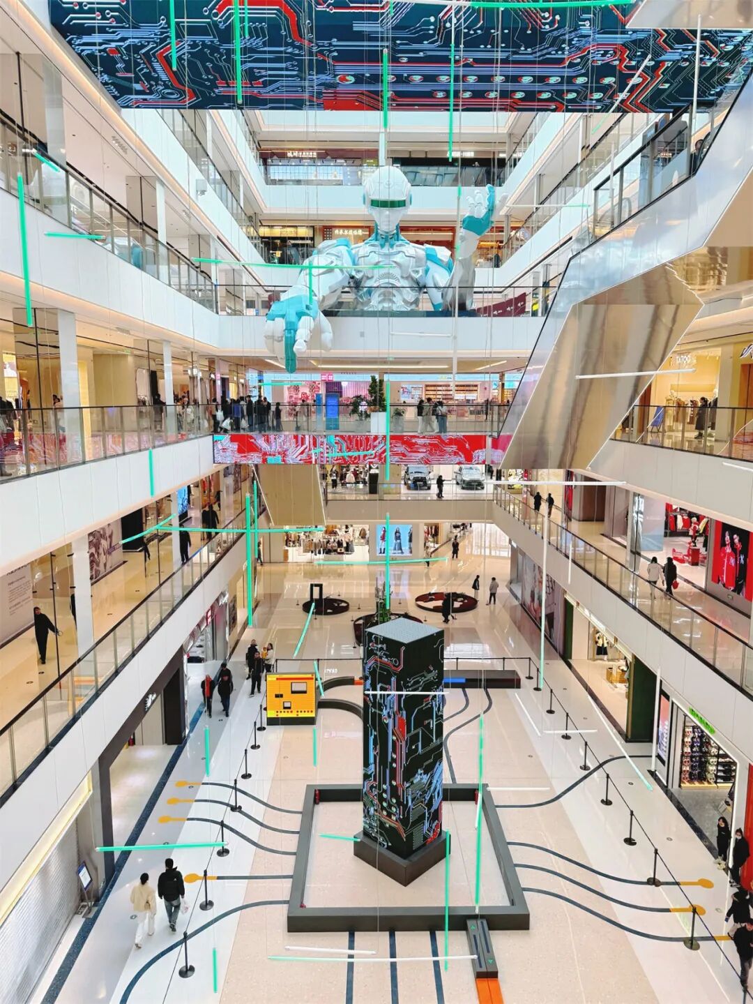 商场中庭上方,巨大赛博机器人展览线上传播火热,自发打卡的朋友不计其数,把数字科技的风吹到了家门口。