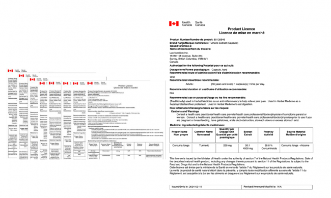 LUX NUTRITION生产产品均具备加拿大NPN认证号