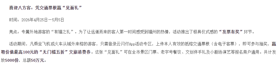 - 福建福州:凭外地抵榕交通票根,可参与抽奖赢取文旅消费券;