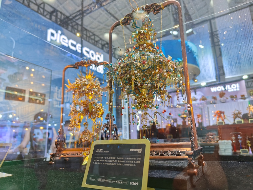 东莞微石文化科技有限公司总经理熊毛介绍,旗下品牌拼酷已推出超过2000款产品,涵盖非遗、国宝文物、古典建筑、民族乐器等40多个主题,远销全球100多个国家和地区。此次消博会上,拼酷带来了与热门IP《白日提灯》联名打造的“万灵灯”成品模型及同款冰箱贴,成为展区争相打卡的大爆款。作为消博会首秀新品,4月全新产品《奇境·探梦帆船》不仅同步线上预售,在消博会现场,潮玩爱好者更能“面对面”抢先购买。