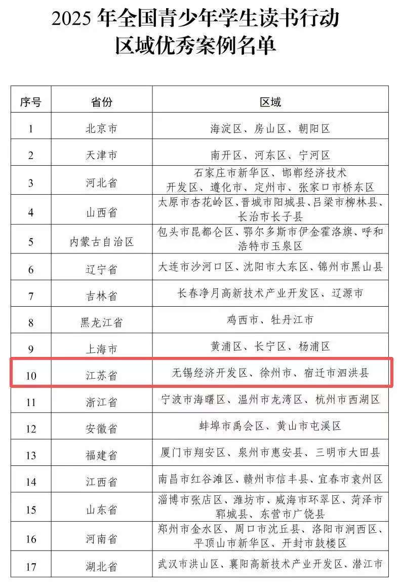 交汇点讯 日前,教育部公布2025年全国青少年学生读书行动区域优秀案例名单,经各省级教育行政部门推荐、教育部审核,共99个案例入选。其中,江苏省无锡经济开发区、徐州市、宿迁市泗洪县3个案例入选名单。