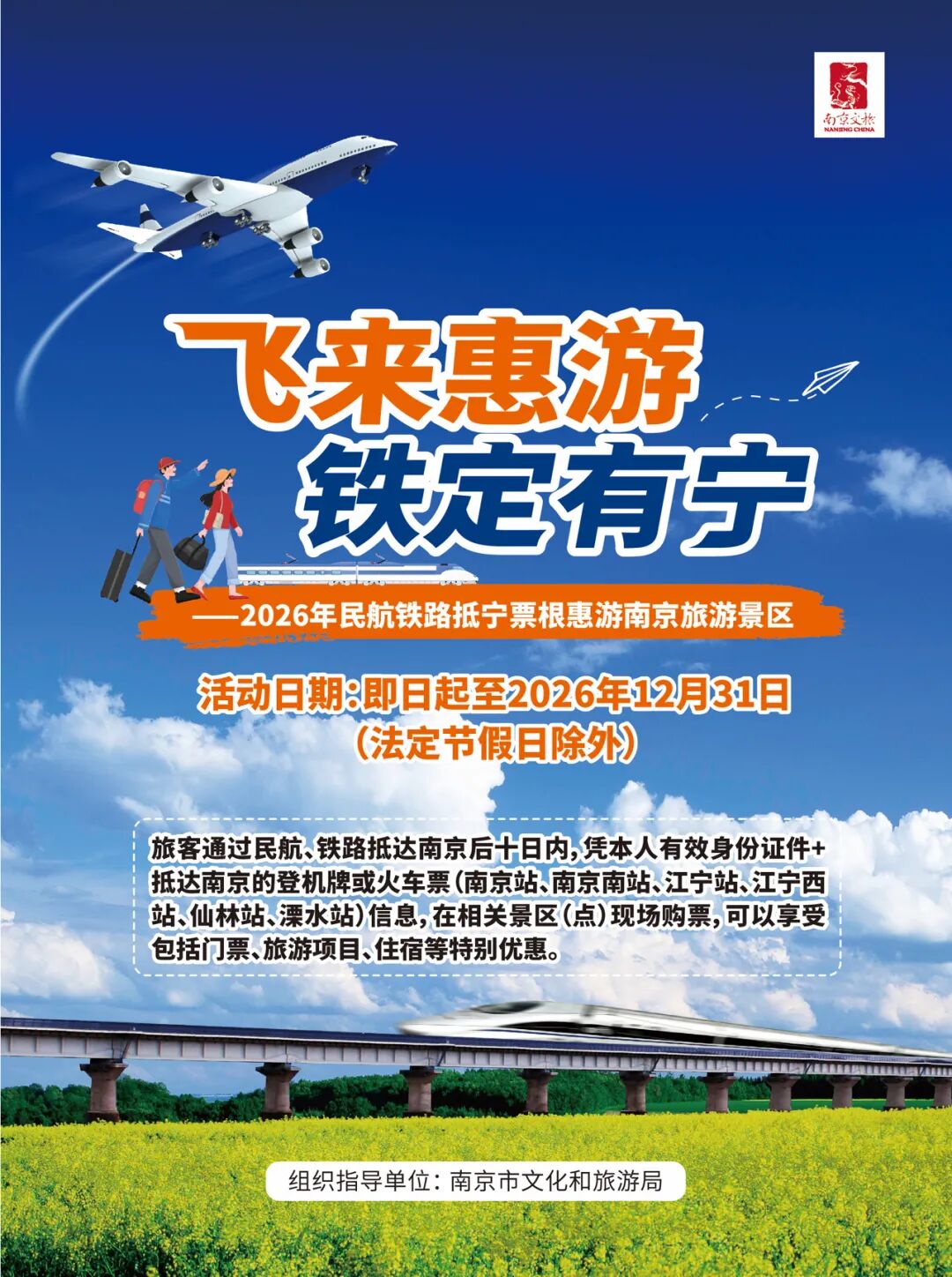 旅客通过民航、铁路抵达南京后十日内,凭本人有效身份证件+抵达南京的登机牌或火车票(南京站、南京南站、江宁站、江宁西站、仙林站、溧水站)信息,在相关景区(点)现场购票,可以享受包括门票、旅游项目、住宿等特别优惠。