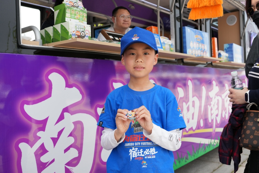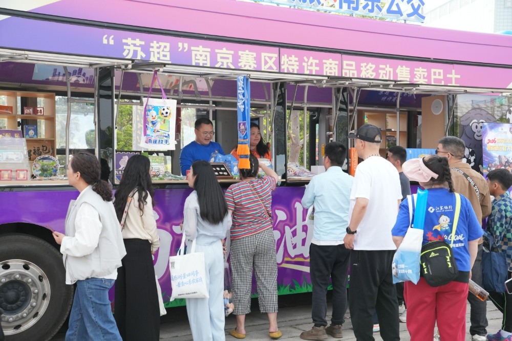 巴士内还设有沙发卡座交流区域,部分球迷在观赛前后停留休憩、选购商品并拍照留念。宿迁球迷沈女士在现场表示:“苏超让城市间靠得更近,看到南京公交带来的文创巴士,觉得特别惊喜。”