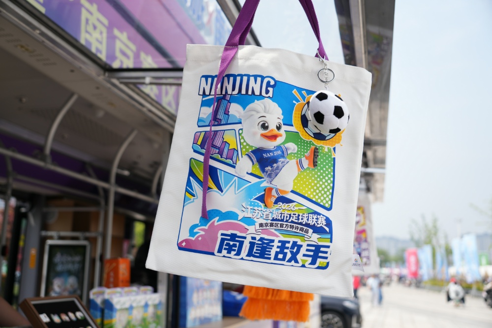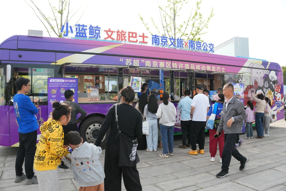 巴士内部经改造后设置了移动文创售卖区域,集中陈列南京赛区官方特许商品,包括“莱斯鸭”系列冰箱贴、南京主题徽章盲盒、球迷应援物品,以及南京红山森林动物园、牛首山文化旅游区等联名限定产品。售卖现场同步开启线上直播,球迷也可通过线上渠道选购相关文创商品。这一形式将体育赛事与文化消费进行对接,是南京推进“公交+文旅”融合模式的一次具体实践。