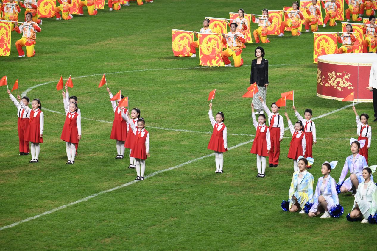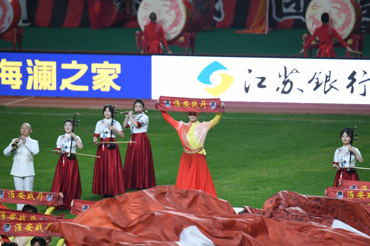 开场节目《开门红》以磅礴气势震撼来袭,美好寓意预祝球队旗开得胜。该节目以民乐团与大型鼓阵舞的形式上演——40名民乐团演奏家配合12面立鼓,以其高亢嘹亮、气势磅礴的音色,既是助威的战歌,更是淮安向所有对手宣告决心的宣言。