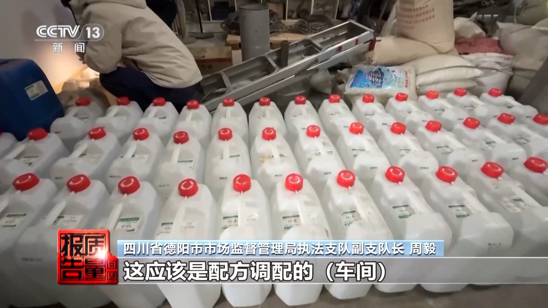 四川省德阳市市场监督管理局执法支队副支队长 周毅:这应该是配料调配车间。这个就是食品添加剂乙酸乙酯,不同香型的酒,就需要不同的食品添加剂来勾兑。