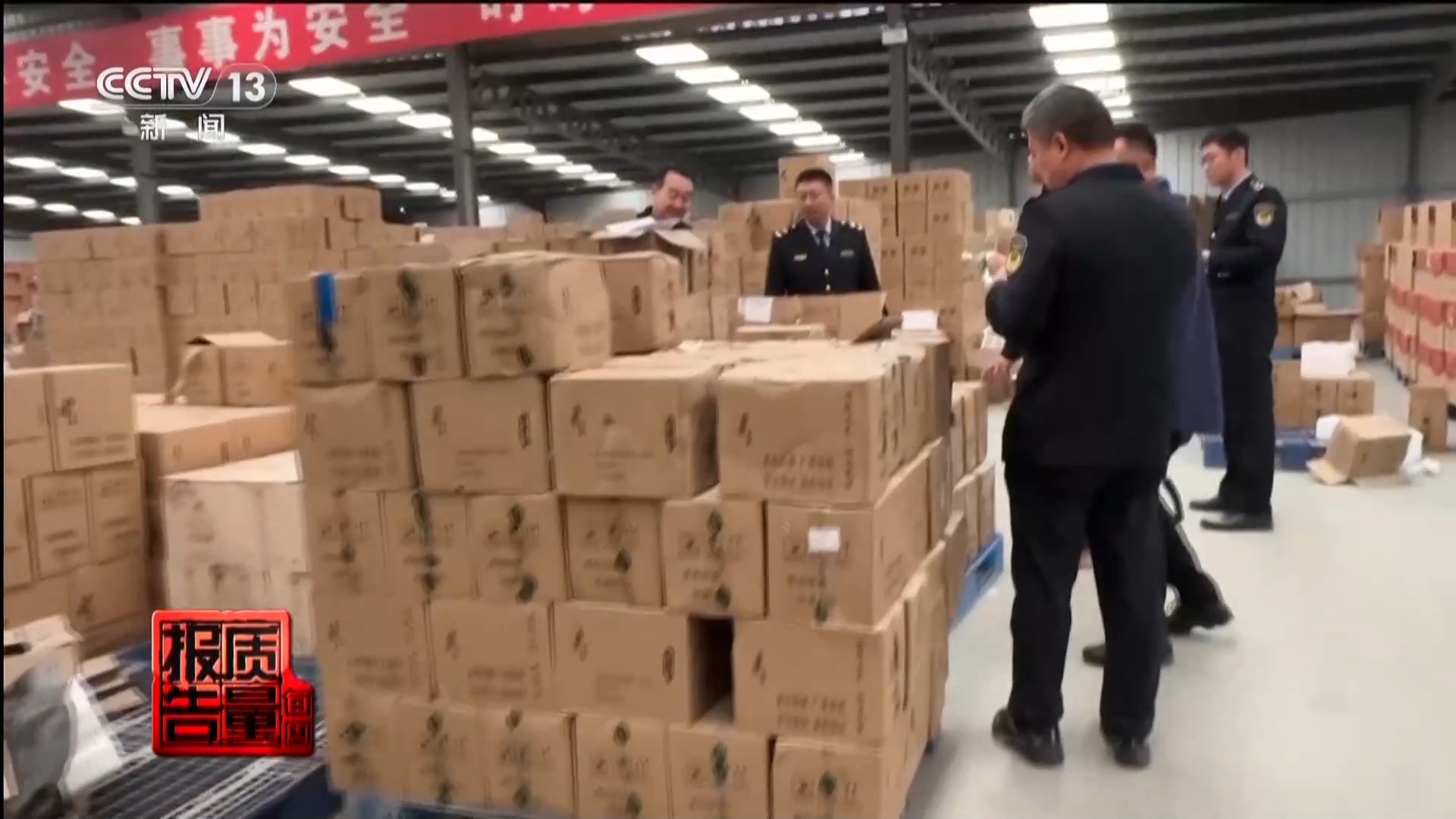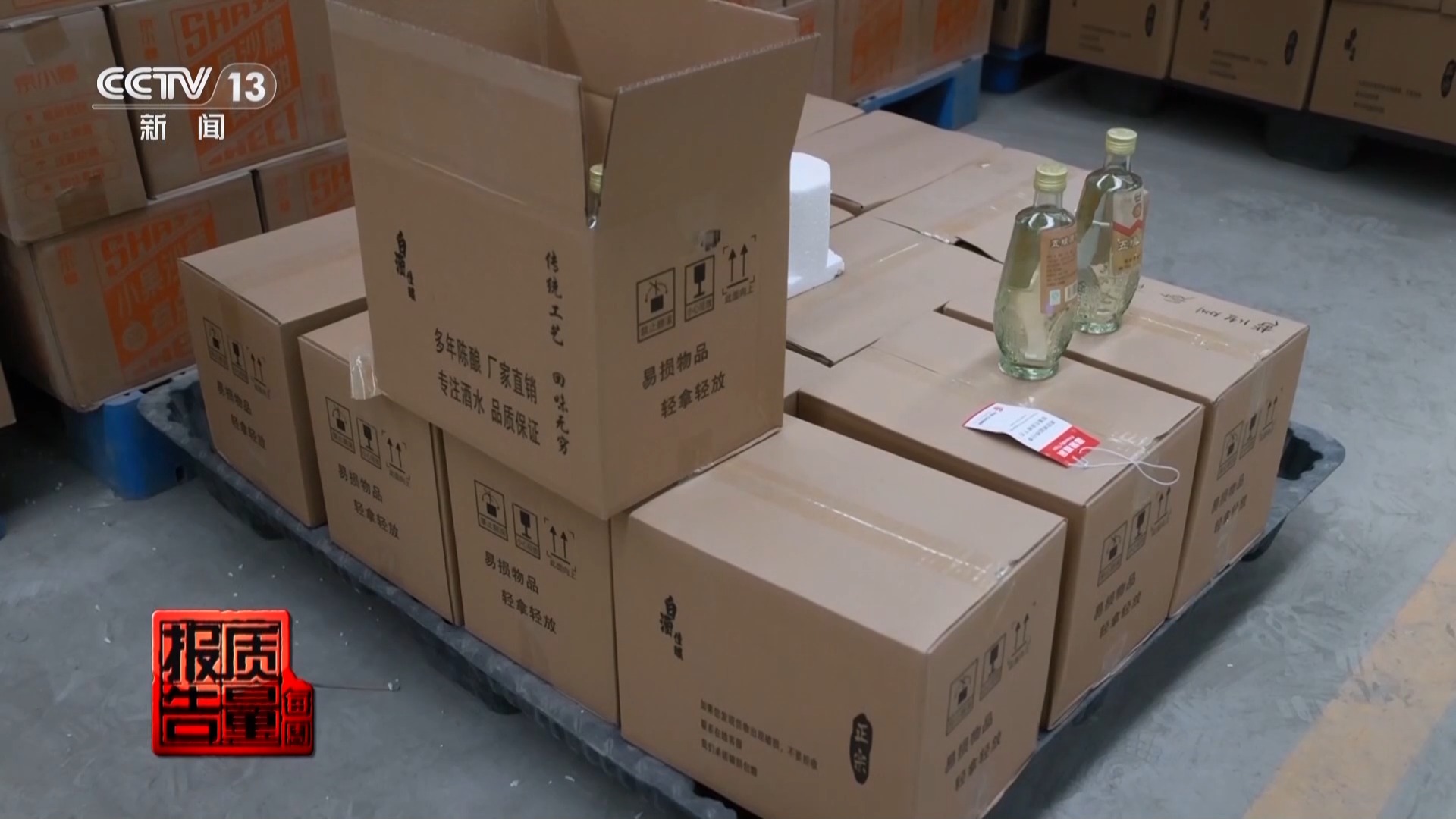 根据摸排,执法人员在文水县一物流园区,找到武后乡酒业有限公司的另一仓储。仓储的最里面,产品堆积如山,占据面积近千平方米。记者注意到,这些等待发货的假酒,虽然箱体大小不一,但从外观看起来特点基本一样:没有标注任何品名和厂名厂址等基本信息,仅有“多年陈酿,厂家直销,专注酒水,品质保证”字样。