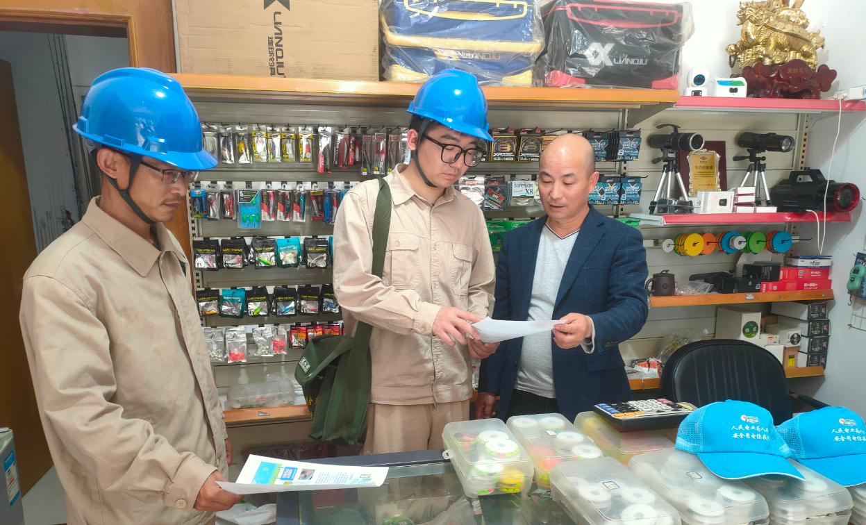 “远离电力线,就是守护生命线!”行动当日,工作人员分头深入沿岸垂钓区与集镇渔具门店,面对面讲解线下垂钓危害、触电防范要点及电力设施保护法规,发放《致垂钓爱好者一封信》与安全手册;同步对周边线路、杆塔、配电房展开隐患排查,即时劝阻危险垂钓行为,现场答疑解惑。渔具店内,一张张醒目的安全警示标语被张贴在显眼处,引导经营者化身义务宣传员,共筑安全防线。